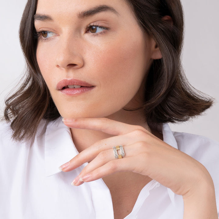 Smooth stations of 18K gold set by sterling silver Caviar beading form this ring.