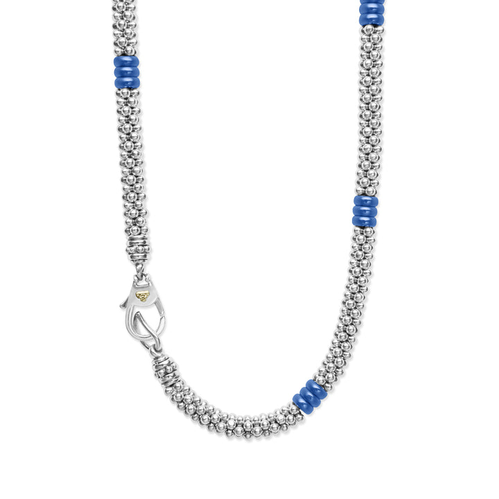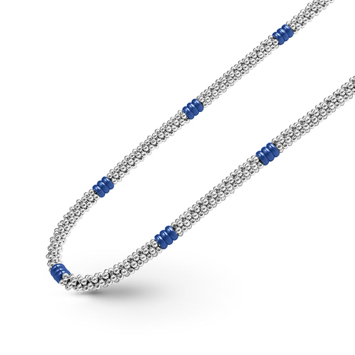 A sterling silver Caviar beaded necklace with nine ultramarine ceramic stations. Blue Caviar Ceramic Three Bead Station Caviar NecklaceSterling Silver & 18K GoldRope width 5mmLength available in 16 inches and 18...