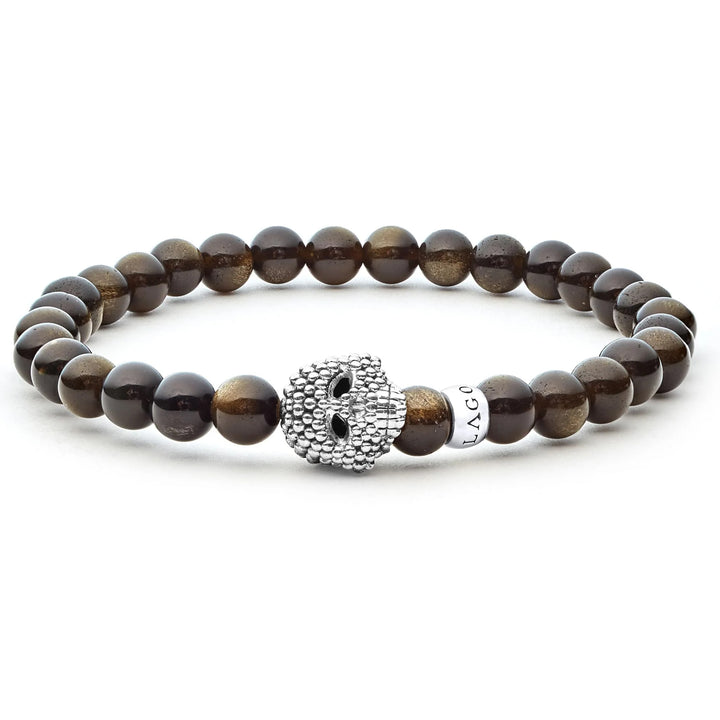 Golden obsidian gemstone beaded bracelet with a sterling silver Caviar skull.