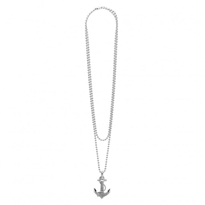 An anchor pendant featuring Caviar beading. Finished on a versatile 34 inch sterling silver ball chain necklace. Sterling Silver 34 Inch 2.5mm Ball Chain Dimensions 41mm x 23mm STYLE #: 07-80993-B34