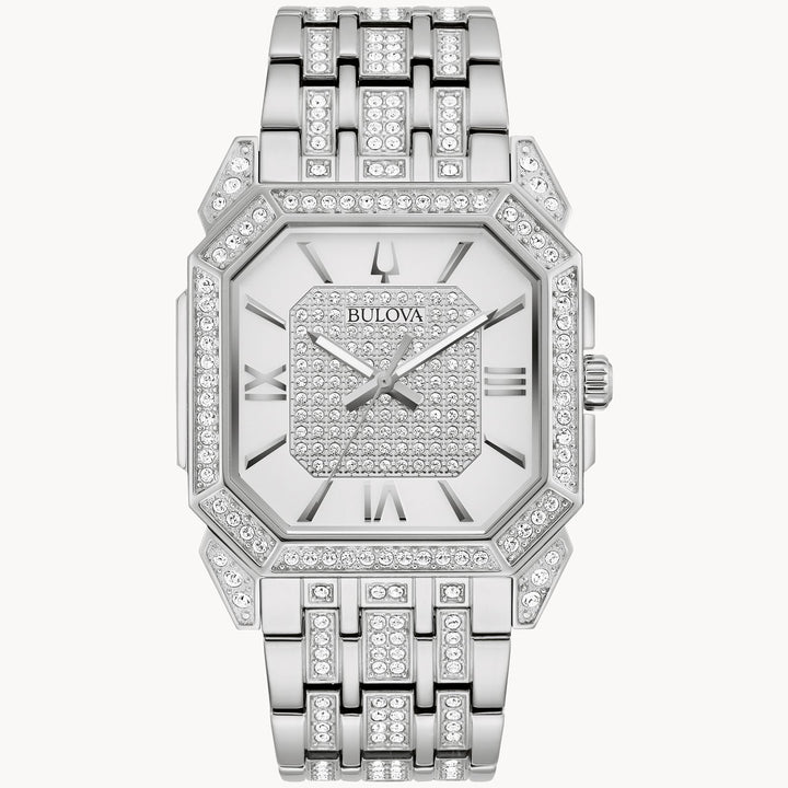 The latest statement timepiece from the dress crystal Octava collection arrives with brilliant style and contemporary appeal. The new, angular-shaped silver-tone stainless steel case surrounds the 3-hand silver-white and pave dial with bold Roman numeral accents and features 300 hand-set crystals positioned on the dial, case, and bracelet to enhance the striking design. The silver-tone bracelet has a deployant buckle with pushers for easy closure. This sophisticated timepiece will take the wearer from day to night with effortless style.