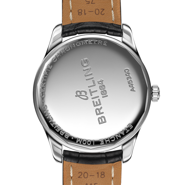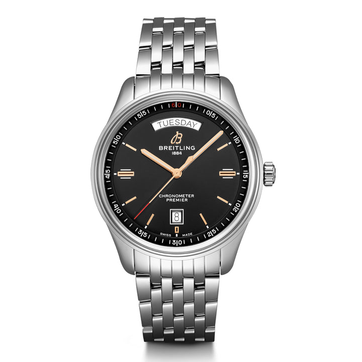 The stylish, elegant Premier Automatic Day & Date 40 has day and date windows at 12 oclock and 6 oclock respectively. Its ideally-sized 40 mm stainless steel case and features a bold black dial with gold central hour, minutes, and second hands. At its heart is the Breitling caliber 45, a COSC-certified automatic chronometer movement with a 38-hour power reserve. The Premier Automatic Day & Date, which is available with a seven-row stainless steel bracelet, a crocodile leather strap or a nubuck leather strap, is a true study in casual elegance - a watch that beautifully completes any wardrobe.