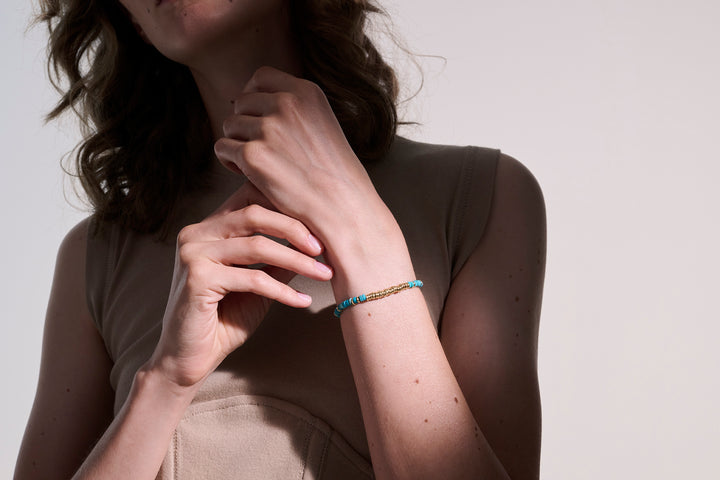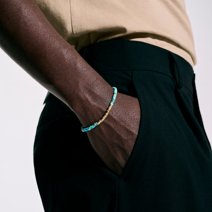 Classic Chain Heishi 14K Gold Bracelet with Pusher Clasp with 4mm Treated Turquoise Bead, Size UL
