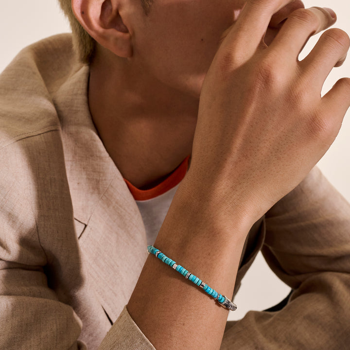 Artisanal beads cut from untreated hardstones lend one-of-a-kind color and wabi-sabi character. Perfectly imperfect. Style No.: BUS9012521TQXULMetal: Sterling SilverStone: Treated TurquoiseGauge: 4MMClosure: Hook ClaspSize: M