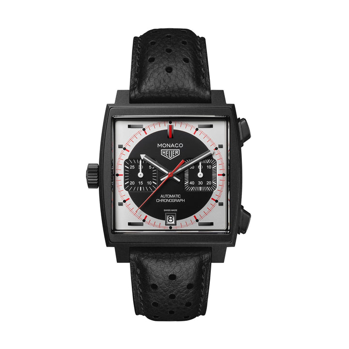The TAG Heuer Monaco Chronograph Stopwatch combines the Calibre 11, a black DLC titanium case, and a HEUER-signed dial in a limited-edition tribute to original TAG Heuer stopwatches. With striking red accents and vintage-inspired elements, it’s a fitting homage to the brand’s rich motor racing legacy.