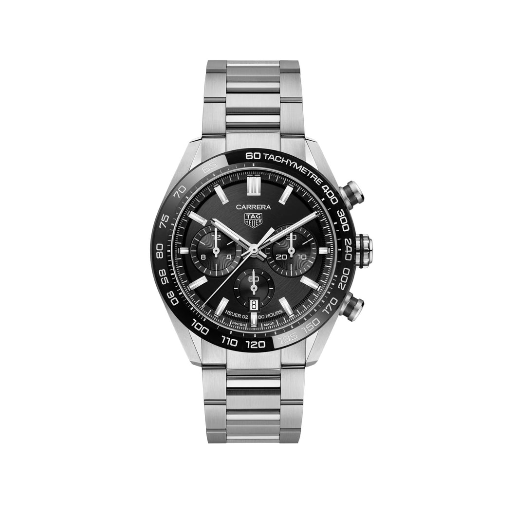 A sleek, all-black TAG Heuer Carrera with 44mm steel case, circular-brushed dial and ceramic tachymeter fixed bezel. The signature H-shaped bracelet is in stainless steel, with proprietary folding clasp and double safety pushbuttons. Silvery rhodium-plated counters, indicators, indexes and hands and the double anti-reflective sapphire crystal ensure perfect legibility at top speeds and in all weather.