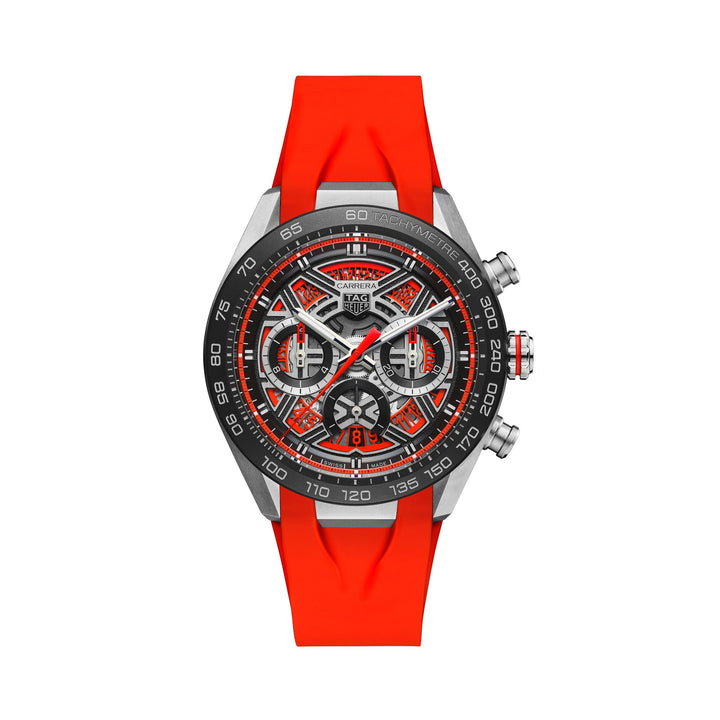 Experience the thrill of motorsport with the TAG Heuer Carrera Chronograph. This 44mm timepiece features a skeletonized dial, showcasing the mechanics of passion in black and orange. Encased in robust grade 2 titanium with a black PVD side and a ceramic bezel, it's powered by the dynamic TH20-00 movement. Built for speed.