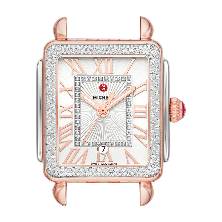This two-tone Pink Gold Deco Madison Mid shines with 148 hand-set diamonds on the bezel and atop the silver white sunray dial. The two-tone Pink Gold bracelet is made specifically for the Deco Madison Mid collection and is interchangeable with any 16mm MICHELE strap.