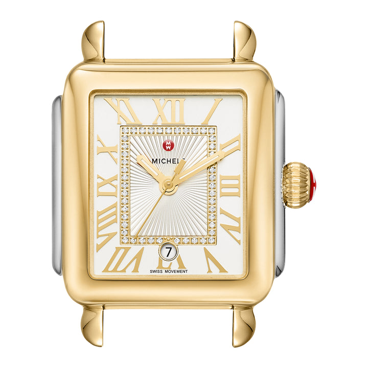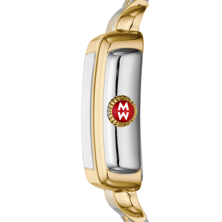 This two-tone Deco Madison offers a sleek take on the classic Deco with gold-plated Roman numeral indexes and 47 diamonds on the silver sunray dial. The two-tone bracelet is interchangeable with any 18mm MICHELE strap.
