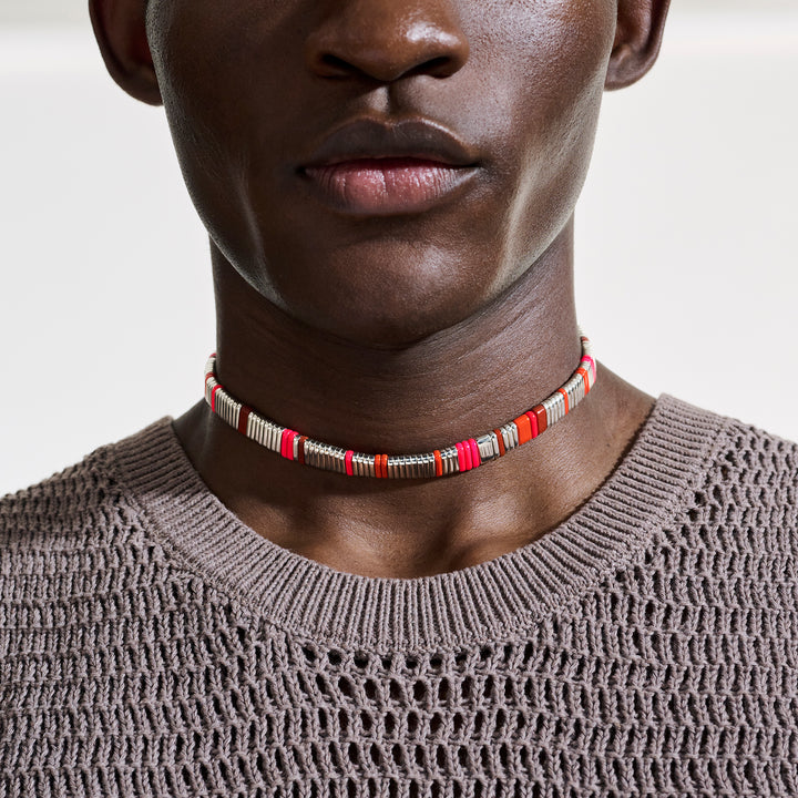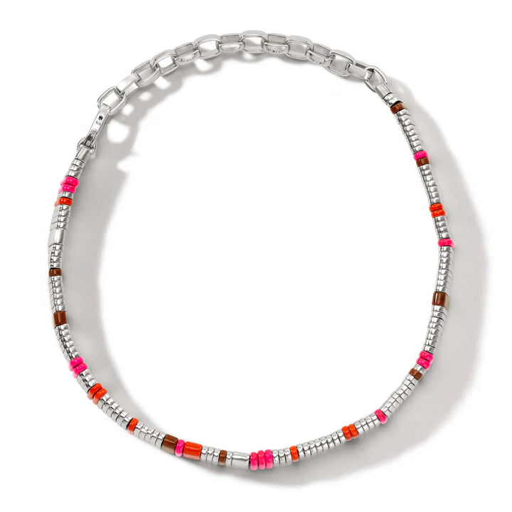 Vibrant hand-cut hardstones and neon enamels. The feeling of uninhibited optimism and freedom. Style No.: NBS9010511PKORRJX12-16Metal: Sterling SilverStone: Red JasperGauge: 10MMClosure: Lobster ClaspSize: 12-16